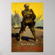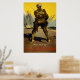 A world War I poster showing a rear view of a soldier facing the battlefield.
