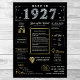 This BACK IN 1927 digital poster is filled with fun facts, news, and highlights of what happened years ago. With faux gold and silver accents on a black background, distinctive icons, and bold typography, the digital poster exudes a timeless, stylish look. It serves as a memorable conversation piece at birthday parties and anniversaries, and when framed, it becomes a thoughtful keepsake gift, adding a touch of nostalgia to any space. Delight your beloved with our Back in 1927 printable poster, a memorable present brimming with nostalgia and individuality. Bursting with captivating details, it offers a personalised voyage through history, making it an ideal selection for marking a cherished birthday occasion. The photo is a printable poster for the year 1927 that includes information such as average income per year, popular baby names, historical events like the 18th Amendment and the Stock Market Crash, inventions of the time, fashion trends like Flapper Dresses and Cloche Hats, slang terms, and average costs of items like a pound of bread and a gallon of gas.