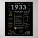 Embark on a journey back to 1933 with our captivating digital poster, brimming with historical facts, news highlights, and intriguing titbits from bygone years. Enhanced with faux gold and silver accents set against a striking black backdrop, adorned with distinctive icons and bold typography, this poster radiates timeless elegance. Whether igniting conversations at birthday parties or anniversaries, or when tastefully framed, it evolves into a cherished keepsake, suffusing any space with a nostalgic allure.