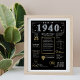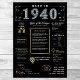 Take a voyage back to 1940 with our enchanting digital poster, overflowing with historical facts, noteable news, and fascinating anecdotes from days gone by. Adorned with faux gold and silver embellishments against a striking black backdrop, embellished with unique icons and daring typography, this poster emanates timeless charm. Whether sparking conversations at birthday gatherings or anniversaries, or when elegantly displayed, it transforms into a cherished heirloom, infusing any space with a nostalgic allure.
