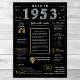 Step into 1953 with our engaging digital birthday poster, filled with historical facts, important events, and interesting stories from the past. Decorated with classy gold and silver details on a bold black background, featuring unique symbols and stylish text, this birthday poster has a timeless charm. Whether sparking conversations at birthday gatherings or kept as a keepsake, it brings back nostalgic memories.