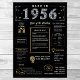 Enter 1956 with our captivating digital birthday poster, brimming with historical facts, noteworthy events, and intriguing stories from the past. Adorned with elegant gold and silver details against a bold black background, featuring unique symbols and stylish text, this birthday poster exudes timeless charm. Whether sparking conversations at birthday gatherings or cherished as a keepsake, it evokes nostalgic memories.