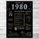 Step into 1980 with our captivating digital birthday poster, overflowing with historical facts, significant events, and captivating narratives from the past. Adorned with elegant gold and silver accents against a striking black backdrop, the birthday poster radiates timeless allure. Whether proudly showcased at birthday gatherings or treasured as a keepsake, it pledges to spark engaging conversations and evoke cherished memories.