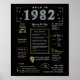 Step into 1982 with our captivating digital birthday poster, overflowing with historical facts, significant events, and captivating narratives from the past. Adorned with elegant gold and silver accents against a striking black backdrop, the birthday poster radiates timeless allure. Whether proudly showcased at birthday gatherings or treasured as a keepsake, it pledges to spark engaging conversations and evoke cherished memories.