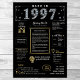 Step back into 1997 with our captivating digital birthday poster, brimming with historical facts, significant events, and enchanting narratives from the past. Adorned with elegant gold and silver accents against a striking black backdrop, this birthday poster exudes timeless charm.