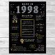 Step back into 1998 with our captivating digital birthday poster, brimming with historical facts, significant events, and enchanting narratives from the past. Adorned with elegant gold and silver accents against a striking black backdrop, this birthday poster exudes timeless charm.