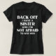 Back Off I have a sister and I'm not afraid to use her. Graphic text saying in bold white fonts. Great if you have a big sister or a little sister that isn't afraid to back you up and take your side.