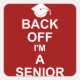 In the style of the popular British "Keep Calm and Carry On" posters, this design for high school students in their senior year says, "Back Off I'm a Senior" with the silhouette of a graduation mortarboard. If you're in the senior class, these stickers would be funny to wear to warn the underclassmen of your cool, upperclassman status. Wear them with senior pride! Background colour is customisable.