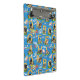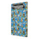 Capital letters A B C D E F G H I J...house pets and school tools against a blue sky repeat pattern
