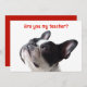 Boston Terrier back to school, welcome message cards from teacher. A cute Boston Terrier on the front is looking upward. Sample wording is "Are you my teacher?". Add your personal message to the students on the back using white, printed text on dark red. Choose the printed, or downloadable option.