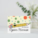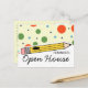 A postcard featuring a design on front consisting of polka dots in various sizes an colours and a yellow pencil. Text reads "REMINDER: Open House." Personalise the back with details of your event.