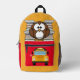 This bright yellow and red backpack features an owl perched on top of the zipper pouch. Behind the owl there are stacks of books. On the red zipper pouch there is an image of a school bus, with an area for your child’s name.
