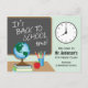 This back to school postcard features a graphic of a wall clock and chalkboard with the text: It's Back to School Time! The postcard is accented with a globe sitting on books, a red apple and a container full of pencils. Customisable text allows you to add your name, grade and school.