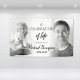 Black and white memorial banner with the message " a celebration of life, in honour of" and personalised with the name and years of the deceased. Customise it by adding a before and after photo of the person as a child on the left and a recent one on the right. Welcome sign for a memorial service or decor for a wake or funeral. To change the photo placement: click on the button to customise it further, click on "crop", and move the image.