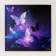 Black background with glowing night butterflies. Night butterflies. Design with butterflies.
