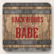 Cool cork back coaster set for those livin' the country life features "Backwoods Babe" distressed dark red text with fancy flourish on a whiskey keg wood background.