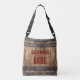 Cool crossbody bag for those livin' the country life features "Backwoods Babe" distressed dark red text with fancy flourish on a whiskey keg wood background.