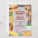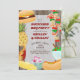 Grillin' & Chillin' Backyard BBQ Party invitation with tasty barbecue food on a rustic wood background. The design has a burger, hotdog, chicken drumstick, kebab, corn on the cob, salad bowl, pineapple and a drink. Backyard BBQ Party, Grillin' & Chillin' (editable) are lettered in retro typography and the invitation template is ready for you to personalise with your details. A fun summer design - ideal for backyard bbq party, annual family barbecue or birthday party for kids or adults alike.