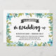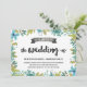 This pretty, backyard garden theme wedding invitation features a beautiful blue and green floral wreath border, pretty brush script calligraphy, and a rustic chic chalkboard banner.