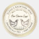 Central design features an illustration of two small hens in a grassy yard. Ivory background with gold grunge border and handwritten fonts.