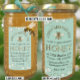 Honeycomb and vintage watercolor bee, with a seafoam green background colour. "HONEY" is written in chiseled metallic gold text. Your name or apiary name is printed in curved text above the honeybee.
