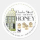 Striking Backyard Hives Honey Label with little bees, dotted border and traditional house and yard. Add your name or apiary name, address, contact info and honey net weight. White background.
