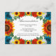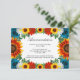 Elegant and colorful floral design for a backyard summer event. Features teal blue roses, white daisies, red wildflowers and sunflowers