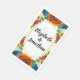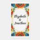Elegant and colourful floral design for a backyard summer event. Features teal blue roses, white daisies, red wildflowers and sunflowers with gold geometric frame