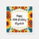 Elegant and colourful floral design for a backyard summer event. Features teal blue roses, white daisies, red wildflowers and sunflowers with gold geometric frame