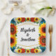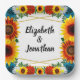 Elegant and colourful floral design for a backyard summer event. Features teal blue roses, white daisies, red wildflowers and sunflowers with gold geometric frame