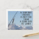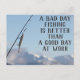 This postcard features a photo of a fishing rod and lure with snow-covered mountains in the background. The text reads, "A bad day fishing is better than a good day at work."