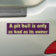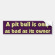 A pit bull is only as bad as its owner. Help stamp out BSL with our awareness bumper stickers. Purple background with gold text.