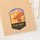 A vintage style design of the Badlands National Park in South Dakota with a deer in landscape of mazes, buttes, canyons, pinnacles and spires.