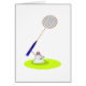 Cute cartoon illustration of a badminton shuttlecock holding a badminton racket ready for a game. Image available on various gifts and products. Greeting cards. Note cards.