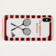 Badminton gifts, racquet and shuttlecock custom iPhone X case design featuring a minimalist black icon of two badminton racquets, a shuttle and a red and blkack border with stripes around.