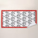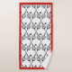 Badminton gifts, racquet and shuttlecock custom bathroom towel set with monogram showcasing a minimalist black icon of two badminton racquets and a shuttle with a red border. The hand towel features black, white and red stripes while the washcloth is in red colour with your monogram.