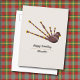 A birthday postcard with bagpipes detailed illustration, adorned with gold and patterns of Celtic knots decorating the bag. Perfect to send to a bagpiper or a lover of Scotland!