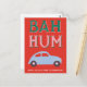 Introducing the Bah Hum Bug Holiday Postcard, a whimsical and lighthearted way to share a dose of holiday humour with your loved ones. The front of the illustrated card features hand-lettered type that reads "BAH HUM" alongside an amusing illustration of a bug car, offering a playful twist on the classic expression "BAH HUMBUG."