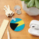 The flag of the Bahamas features a black equilateral triangle on the left representing the unity and determination of the people of the Bahamas. The triangle is orientated towards three equal-width stripes symbolising areas of natural resource; two aquamarine stripes at the top and bottom of the flag representing the sea and one gold stripe representing the land. The flag was adopted on July 10, 1973.