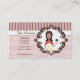 The Baker or Pastry Chef Business Card is a customisable business card with a feminine touch. Perfect to use for a personal business or a business with a physical location. This card can be customised to use for your needs. The illustration features a baker/pastry chef with a yellow apron with hearts on it, a red dress with polka dots, a red head band, and a large cupcake with chocolate frosting designed exclusively by © Cicely James for CiJa Studio. The front background is a pink damask bottom with a chocolate and pink striped top. The back has a list of menu items and website information for business promotion. The writing is a script font in a feminine chocolate colour. Perfect for a professional look with a feminine touch.. Use the personalise feature to the right of the business card demo if you love the font style, colouring and size to just change the demonstration information. If you want to add more text boxes, change the font colour, sizing or style--- click on the orange "customise it" button below the business card demo to change things to suit your personal tastes.