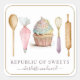 A cupcake baker, bakery, or dessert caterer featuring a lush painted cupcake, with baker's tools and utensils product label, with a gold frame border.