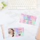 A pink, purple, mint green holographic background. Decorated with blush pink faux glitter dust and cupcakes. Personalise and add business logo and text on front.