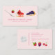 Cute and modern business card for a bakery featuring illustration of cakes, tarts, and fruits.