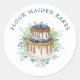 A modern artistic earthy baker pastry chef product label featuring an elegant cake with a eucalyptus foliage frame in a pretty circle style with curved type. Royal blue, blue green and cocoa brown watercolors.