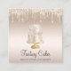 Chic business card for wedding cake designers and specialists, bakeries, pastry chefs and event caterers. The front features champagne gold faux glitter dripping down an ombre gold background, an illustration of a beautiful ornate wedding cake with coordinating glitter icing, and your business name in a stylish soft grey script. On the reverse, input your website address to create a QR code for your customers to scan, and add your name, title and other contact information.