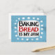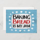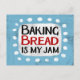 "Baking Bread Is My Jam" is a cute text design in blue with black and red text, along with a white accent shape and white textured whimsical dots surrounding it.