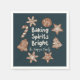 Festive and whimsical Christmas theme napkin for your holiday party featuring hand drawn illustration of holiday cookies. The text says "baking spirits bright."