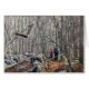 Two woodland hikers and their dog stand transfixed by the flight of a bald eagle