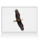 A magnificent bald eagle, photographed as it soars in a vibrant blue sky with eyes cast upward.