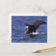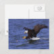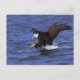 Wings spread, a bald eagle attacks a fish swimming in the open water.